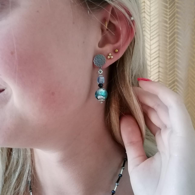 Boucles d'oreille avec de véritables perles en verre de Murano*, perles en cristal autrichien, montées sur des clous d'oreilles en acier inoxydable (réputé moins allergène) et munies de poussoirs en acier.