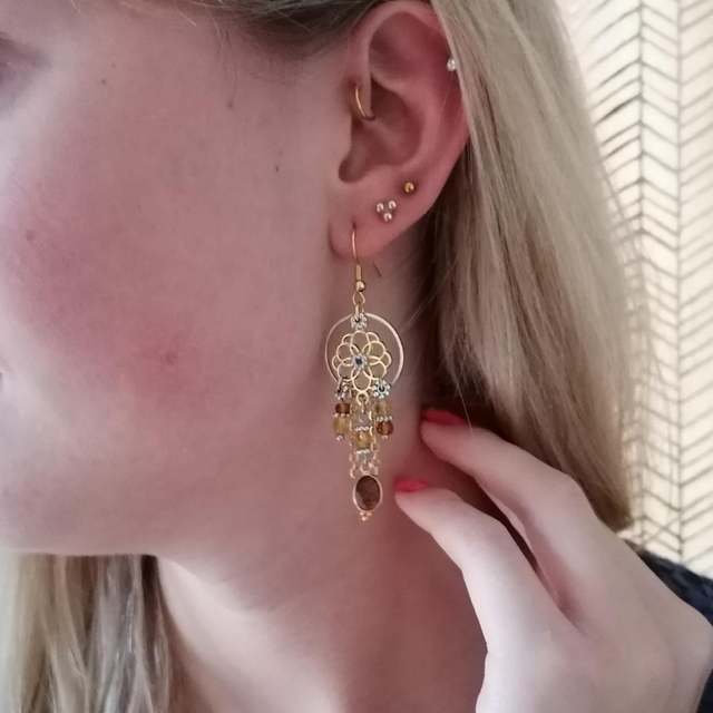 Boucles d'oreilles, estampes en métal doré et acier gris, perles en cristal autrichien, montées sur des supports en acier inoxydable (réputé moins allergène), munis de poussoirs en silicone.