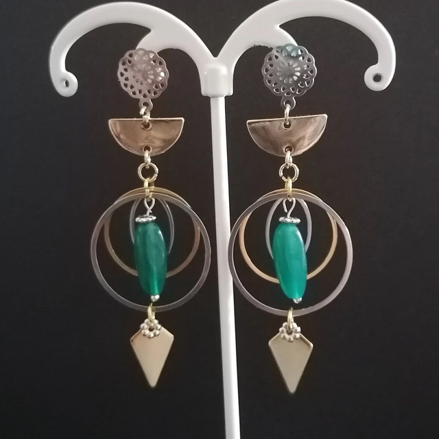 Boucles d'oreilles avec perles vertes et estampes géométriques en acier doré, montées sur des supports en acier inoxydable (réputé moins allergène), elles sont munies de poussoirs en silicone.