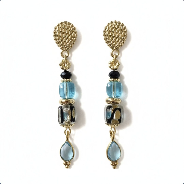 Montées sur des clous texturés au fini travaillé, elles associent des perles en cristal autrichien scintillantes à de superbes perles carrées de Murano*. De délicats pendentifs bleu turquoise, dorés à l’or fin, viennent parfaire l’ensemble pour un rendu harmonieux et sophistiqué.
