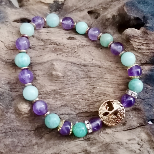Bracelet élastique en pierre naturelle d'Améthyste et Amazonite 6 mm, perle "arbre de vie" couleur or