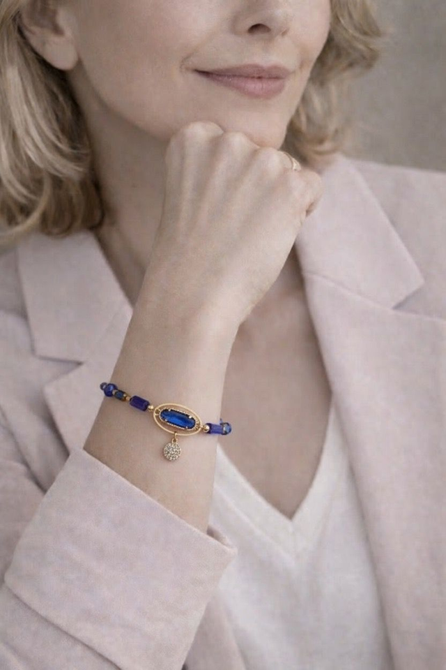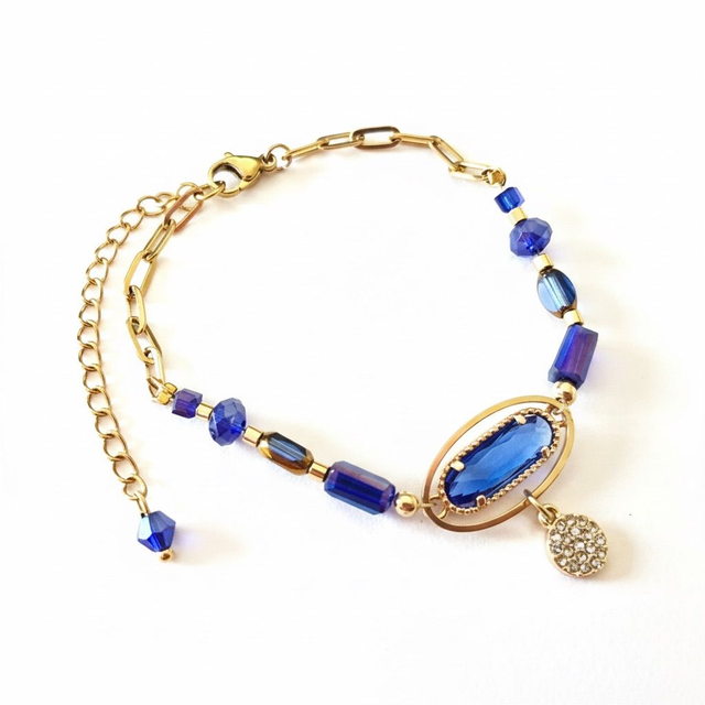 Ce bracelet est composé de perles en verre bleu lagon, associées à des perles en cristal autrichien qui captent délicatement la lumière. Une perle centrale translucide ainsi que des éléments dorés et une pampille décorative viennent souligner le design avec subtilité. La chaîne d’extension et le fermoir sont en acier, pour une finition à la fois solide et élégante.