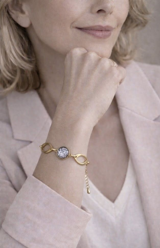 Ce bracelet est composé de cabochons de 10 mm aux motifs serpent beige et gris. Ils sont associés à des éléments ovales en acier doré qui apportent légèreté et élégance à l’ensemble. L’alternance de ces formes crée un bracelet harmonieux au style chic et intemporel.
