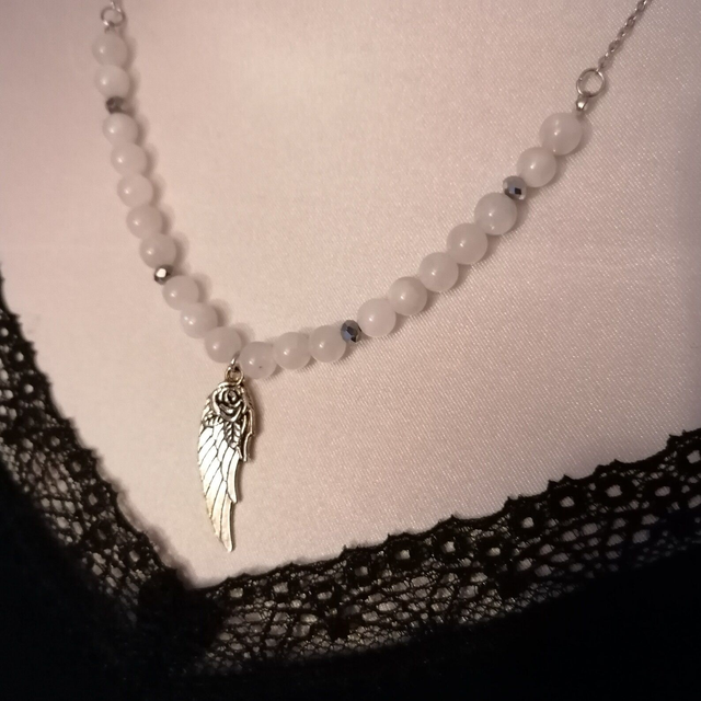Collier en pierre naturelle de Pierre de Lune 6 mm, perles facettées gris anthracite, breloque "aile d'ange" en métal argenté, chaîne et fermoir en acier inoxydable